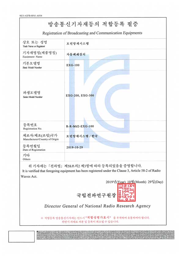 인정서(KC)EXG-100,200,300